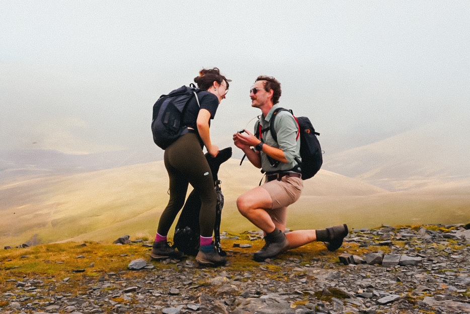 Fast forward to August 2025. On a Lake District adventure, doing what we love most together, we set off hiking. On one of the very first days, at the summit of Skiddaw, Brett got down on one knee…